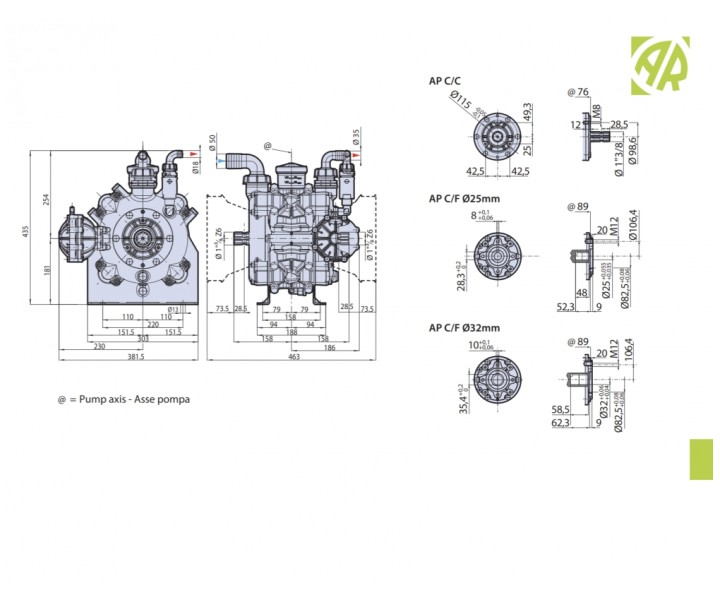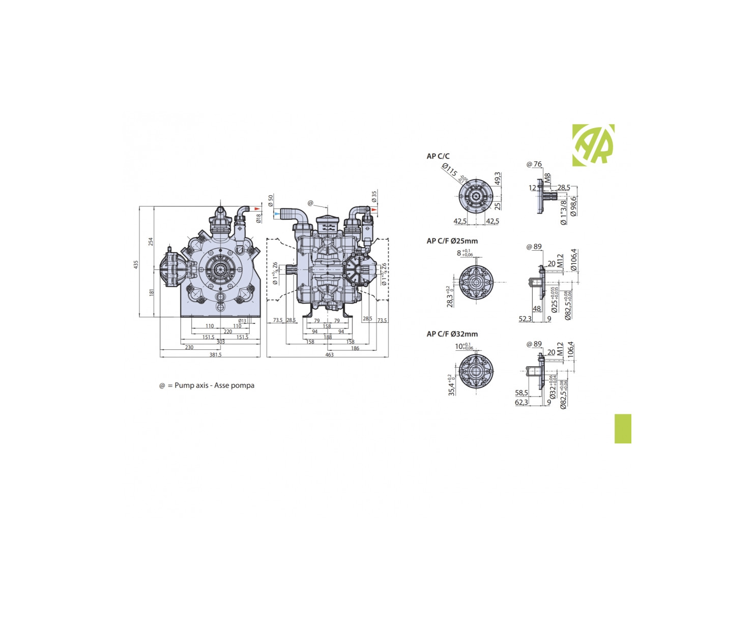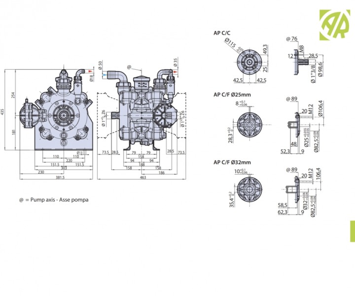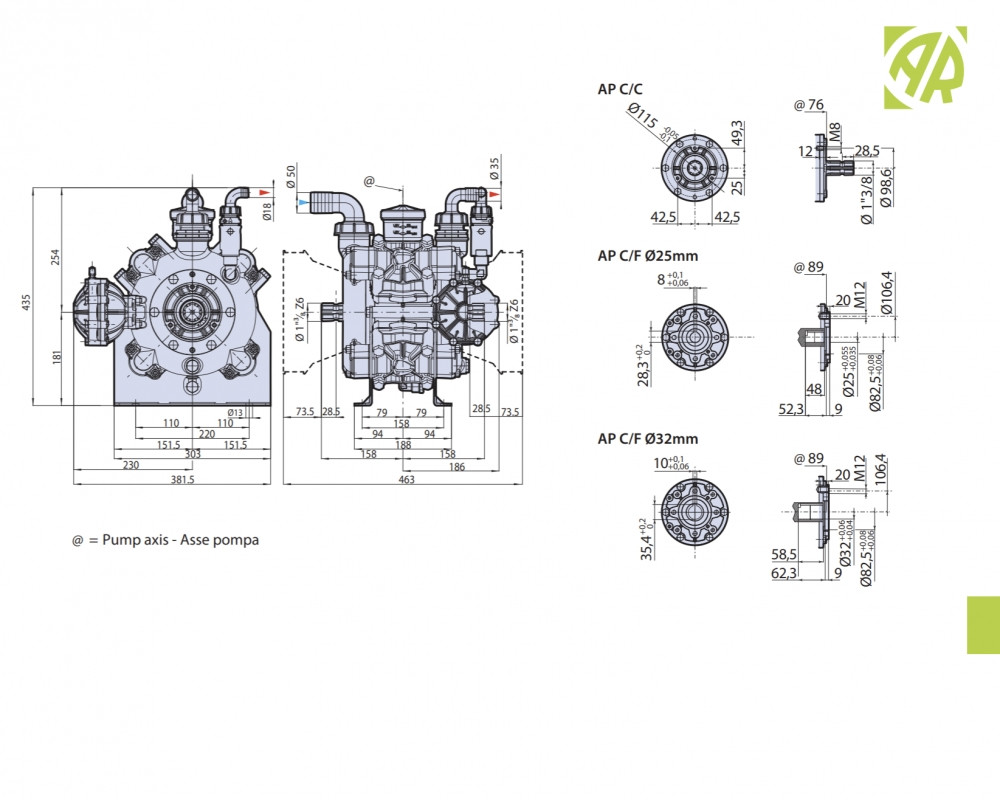 Мембранно-поршневой насос Annovi Reverberi AR 185 bp обеспечивает производительность 182,1 л/мин и применяется на опрыскивателях с шириной штанги от 18 до 24 метров.